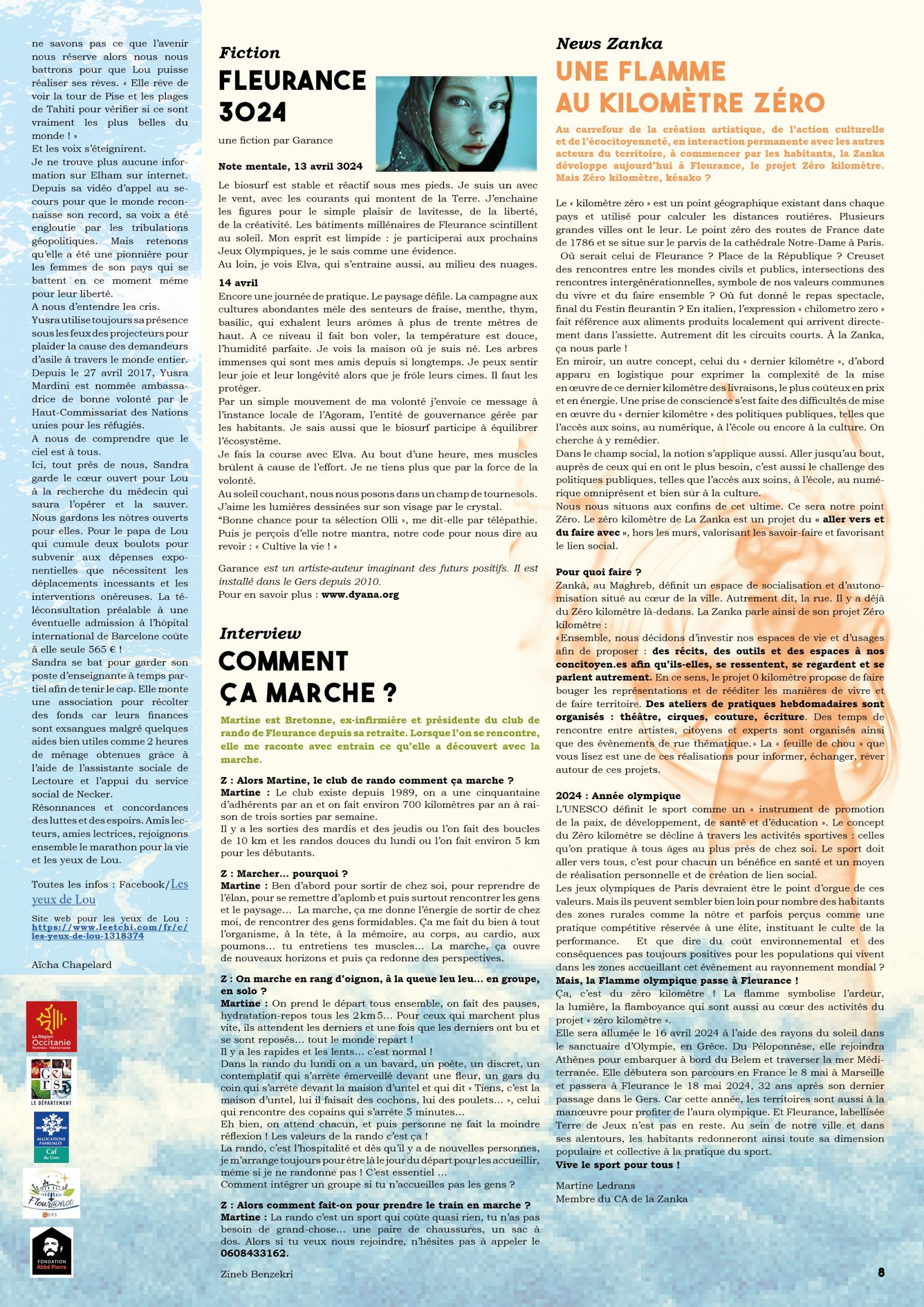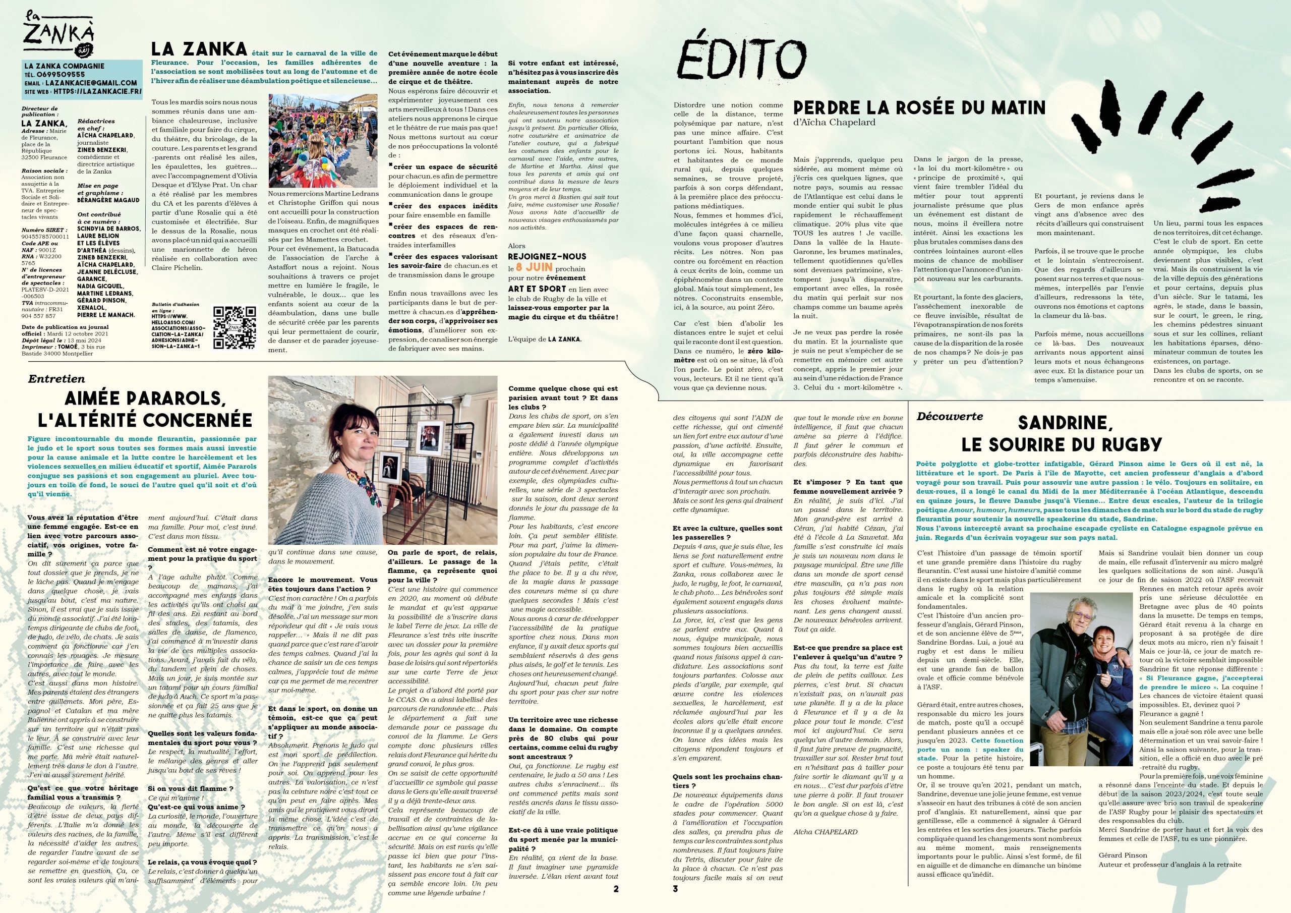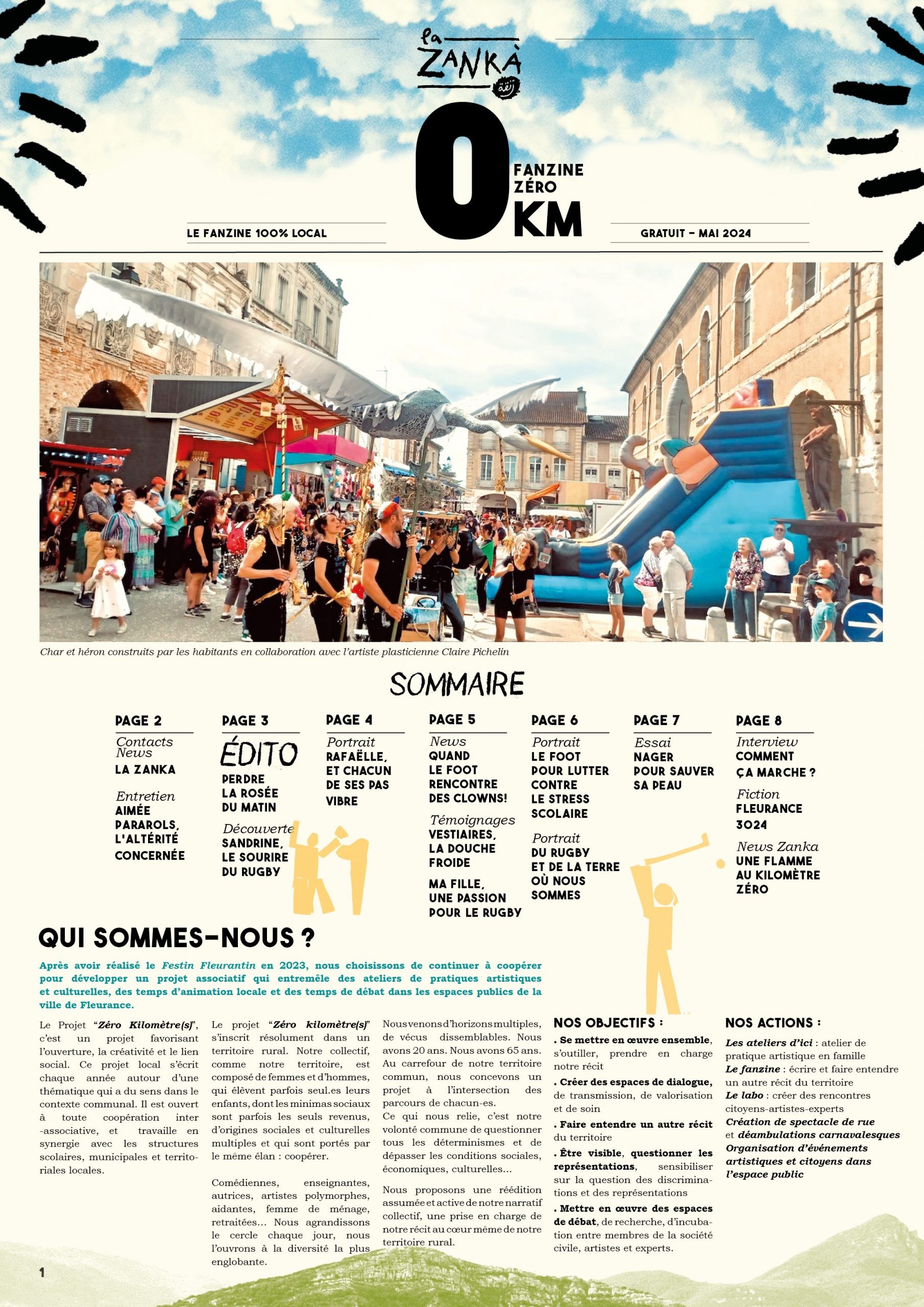 La Cie la Zanka, compagnie de Fleurance (41-Gers), m’a sollicitée afin de retravailler l’identité d’un fanzine qu’ils avaient crée 1 an auparavant. Plutôt que fanzine, un nouveau journal est alors né, bien plus dense, avec une alternance d’articles de personnalités locales et de beaux textes d’auteur(e)s.